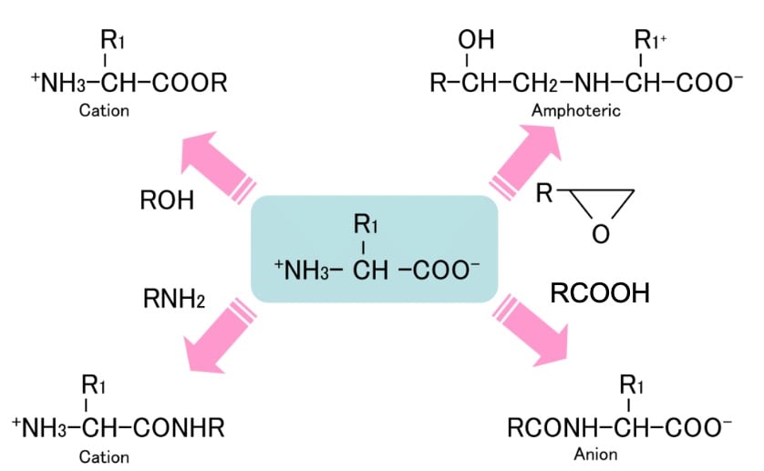 アミノ酸はカルボキシ基(COOH)やアミノ基(NH2)など水に馴染みやすい親水性の部分がすでにあるので、例えばアミノ基に脂肪酸をくっつけるとアニオン界面活性剤になるなど、疎水基を導入することで界面活性剤になります。