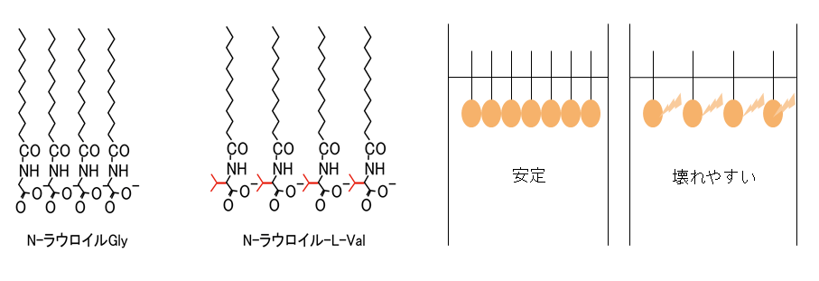 図3 (左)アミノ酸による界面活性剤の構造の違い, (右)界面活性剤の並び方と壊れやすさ.