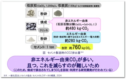 1トンのセメントを生産するには、粉砕した石灰石(炭酸カルシウム)や石炭灰などを焼成する際の熱分解によって約480kg、さらにこれを粉砕するための化石エネルギーまたは電力消費によって約280kg、合計約760kgのCO2を排出します。