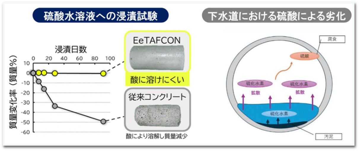 硫酸水溶液への浸漬試験の結果では、従来コンクリートの質量は大きく減少しているのに対して、EeTAFCONは変化していません。