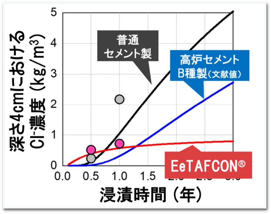 塩水浸漬試験の結果では同じ経過年数の他のコンクリートと比べると、塩化物イオンの浸透が大幅に抑えられています。